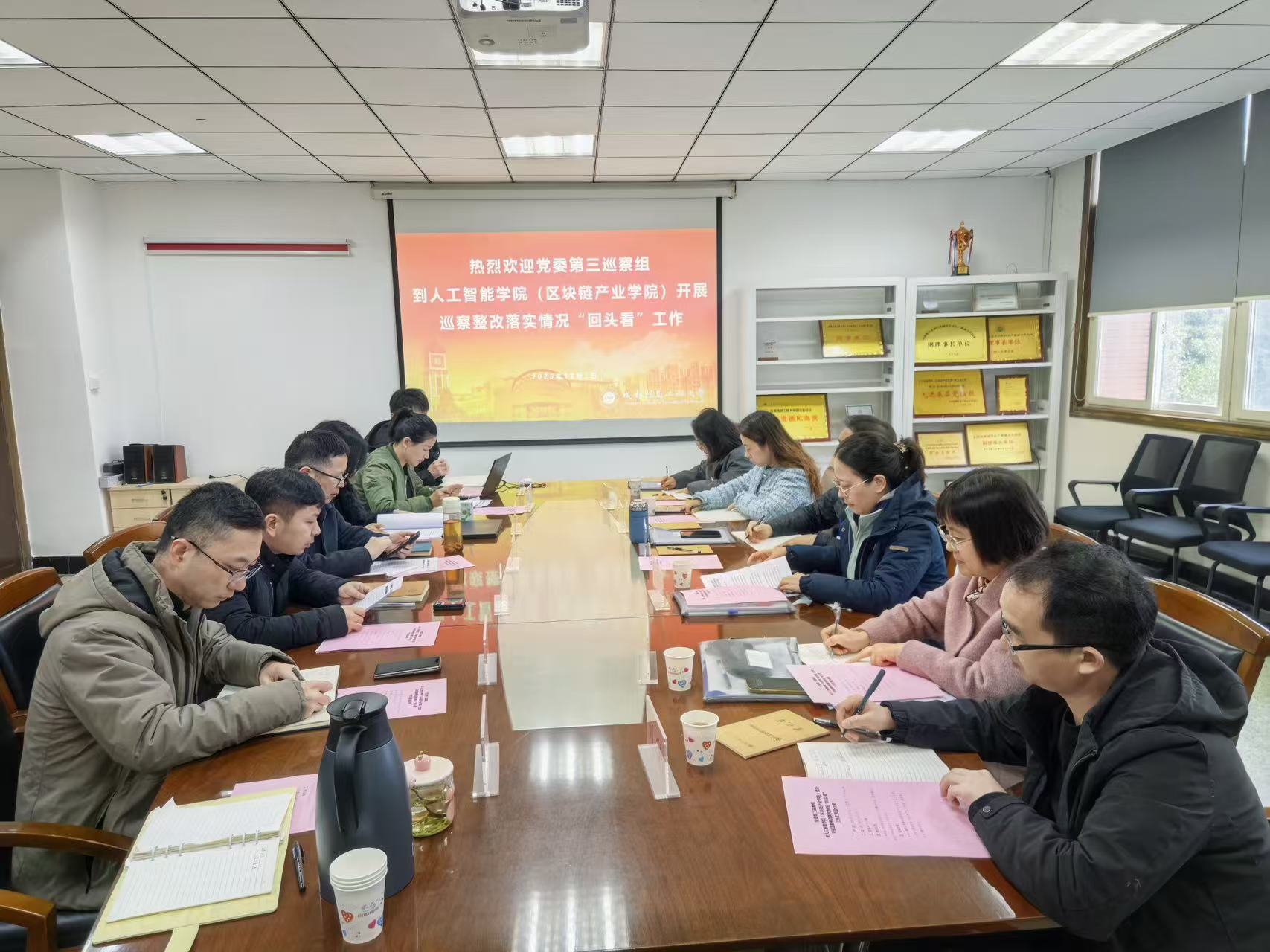 根据学校党委关于巡察工作的统一部署,12月2日上午,学校党委第三巡察组对人工智能学院(区块链产业学院)党委开展巡察整改落实情况“回头看”工作汇报会在学院三会议室召开。党委第三巡察组全体成员、人工智能学院(区块链产业学院)党政领导班子及科级干部参加会议,会议由学院党委副书记林少疆主持。